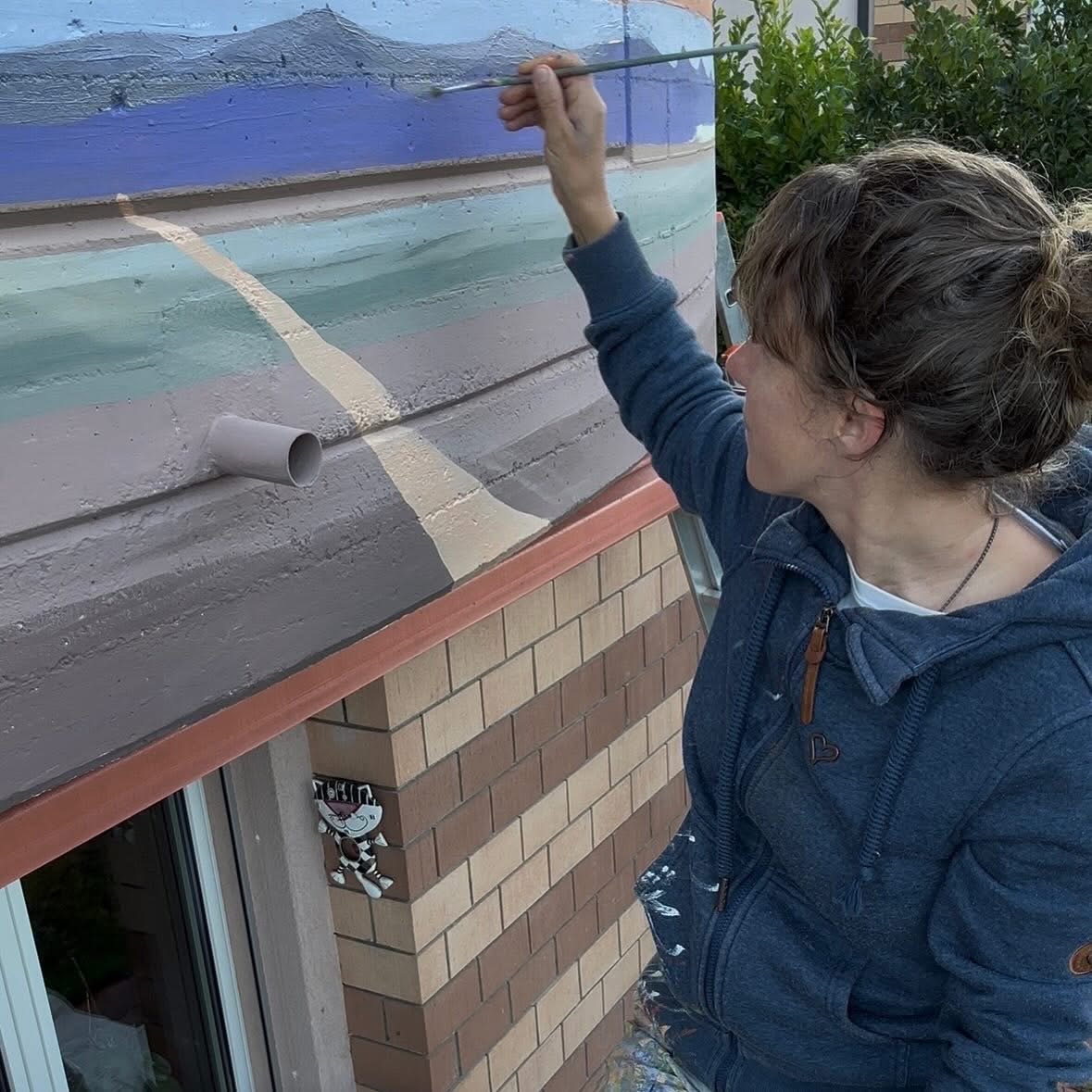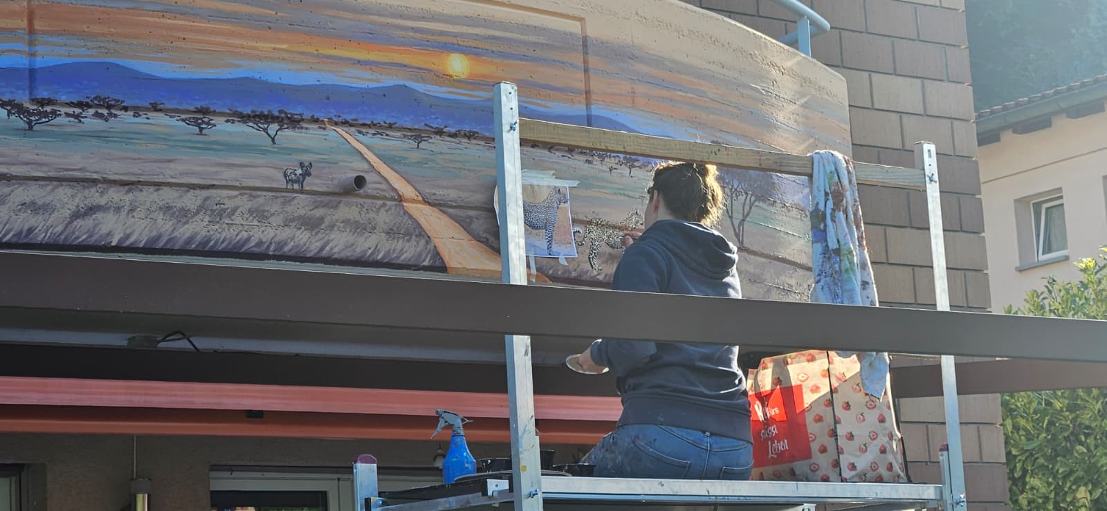 Murales realizzato su un balcone a Purasca raffigurante un paesaggio africano al tramonto con animali tipici della savana. L’opera è stata progettata per trasformare lo spazio esterno in un ambiente suggestivo e personalizzato, creando profondità visiva e atmosfera calda e immersiva.