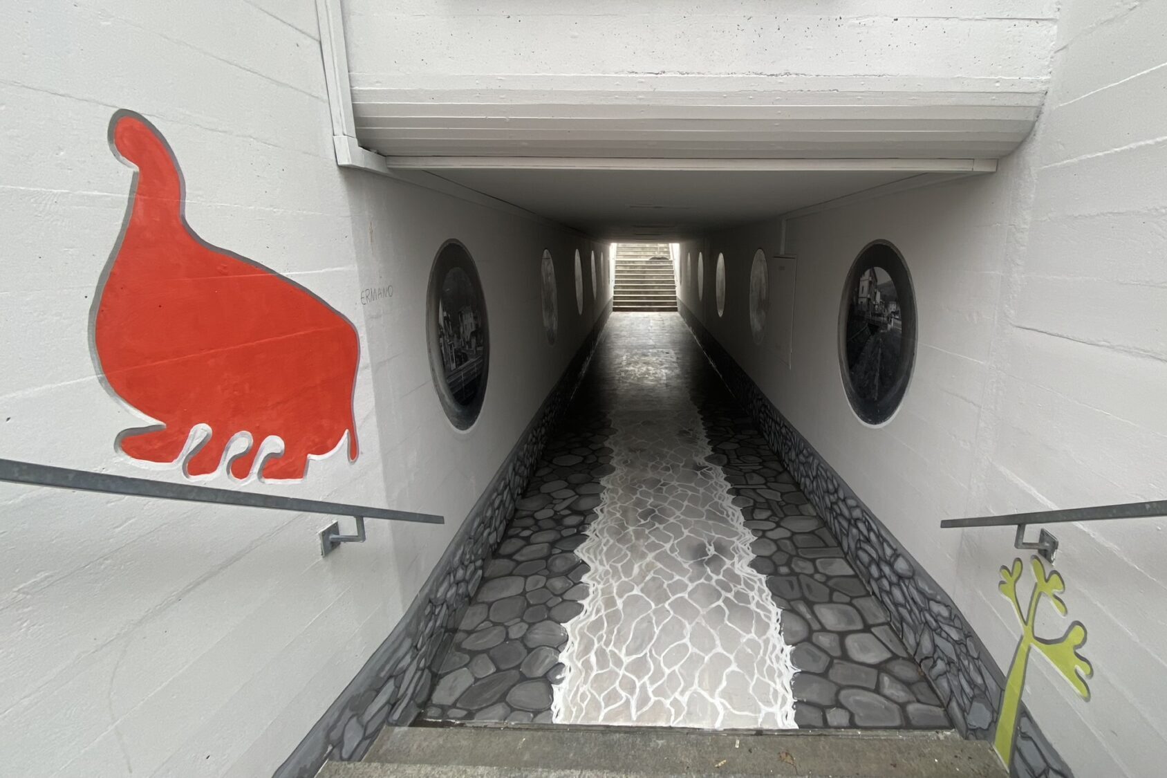 Murales streetart sottopassaggio pedonale a Bioggio strada regina commissionato dal comune di Bioggio.