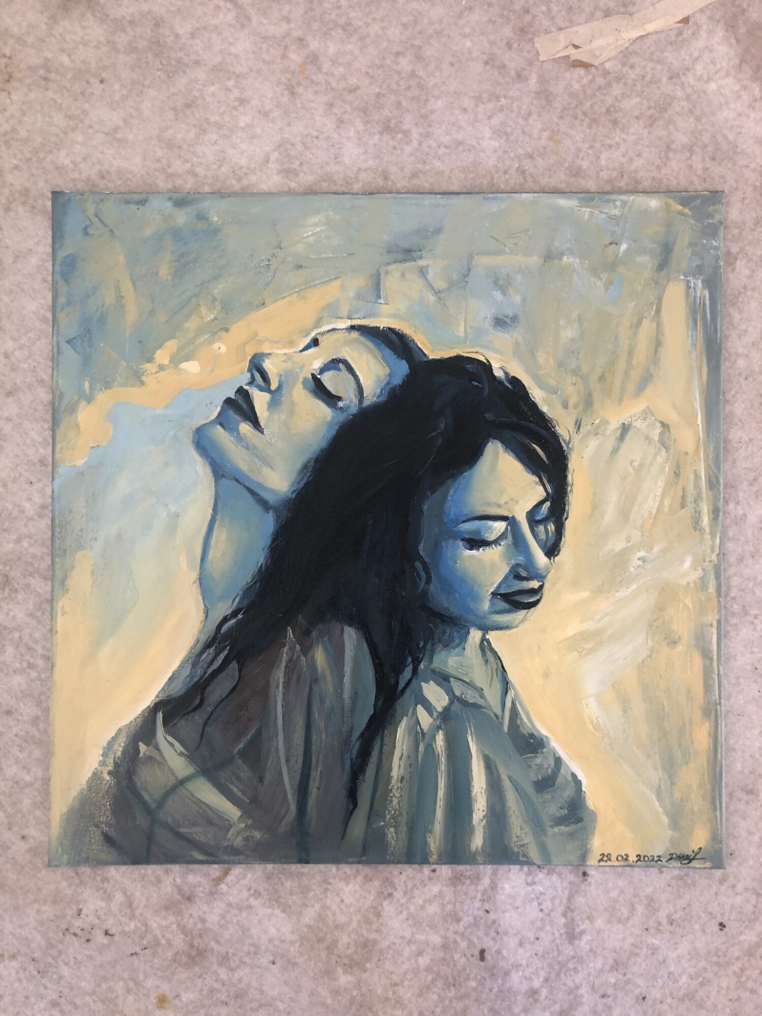 Quadro olio su tela di due ragazze che si appoggiano di schiena