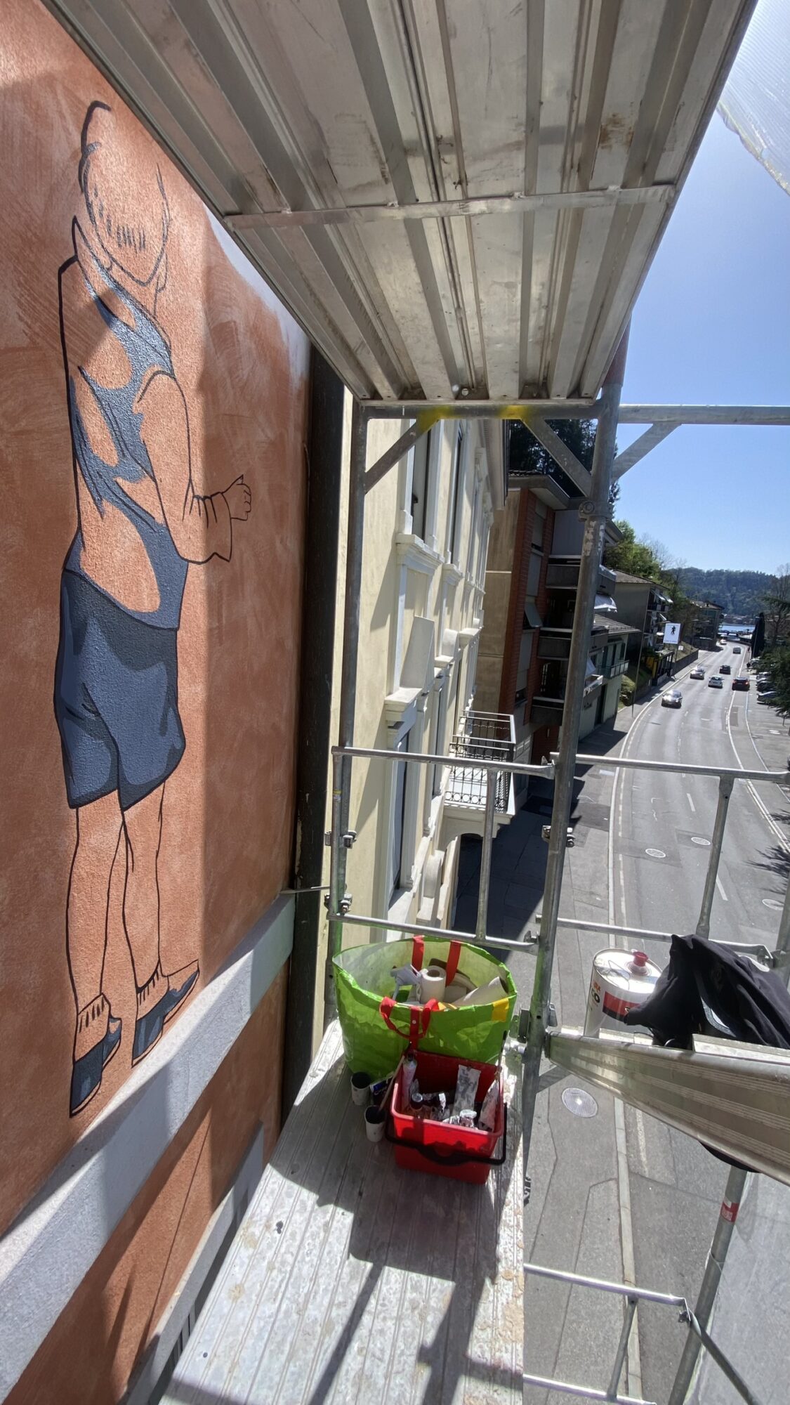 Dettaglio del murale in corso a Ponte Tresa con un bambino in bianco e nero in stile anni '30.